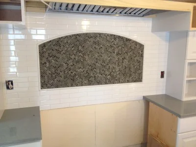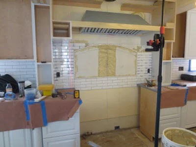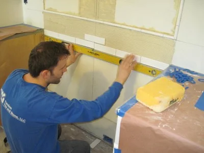 Our tile setter makes sure the backsplash is straight behind the stove.