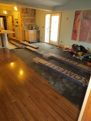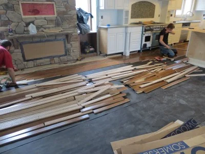We are laying down the pre-finished hardwood floor in the kitchen and family room.