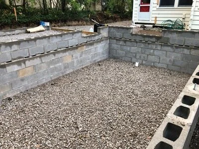 The first row of stone for the patio is carefully laid in place, and relatively soon after, it is almost done.