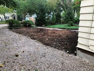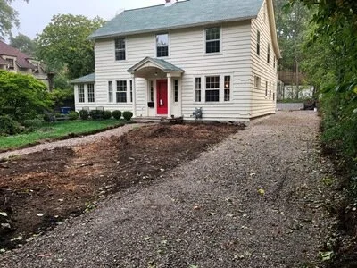 The straight walkway connecting the front door to the sidewalk will be replaced by a curved walkway that will connect the front door to the driveway instead (leveled gravel below).