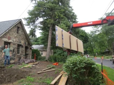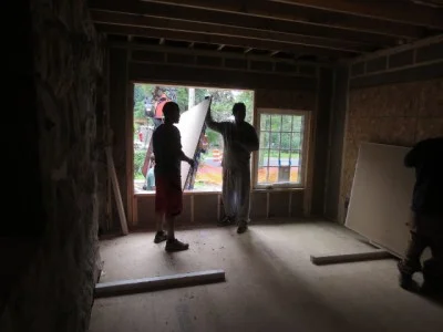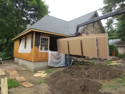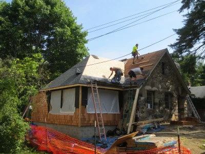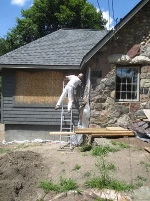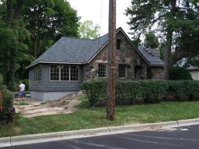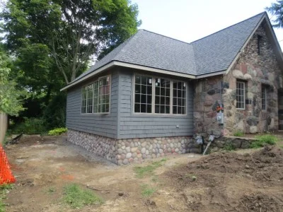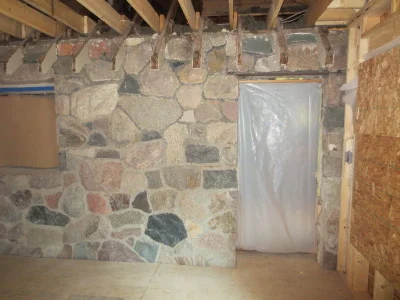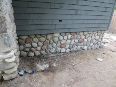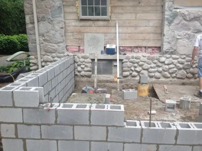 Exposed foundations getting a thin stone veneer to compliment the cobblestone exterior of the original house.