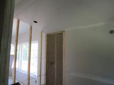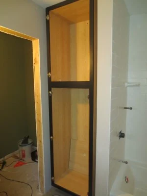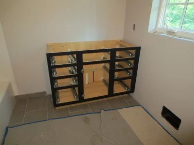 New vanity and linen cabinetry getting installed in the master bath addition.