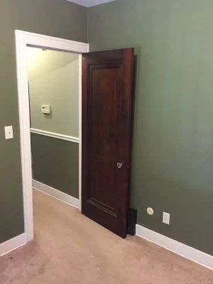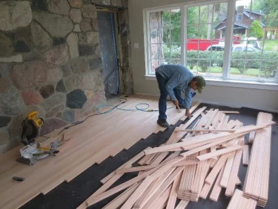 Soild Red Oak strip flooring is installed in the addition. This is sanded in place and coated with an oil based finish, so that it matches the home’s existing hardwood floors.