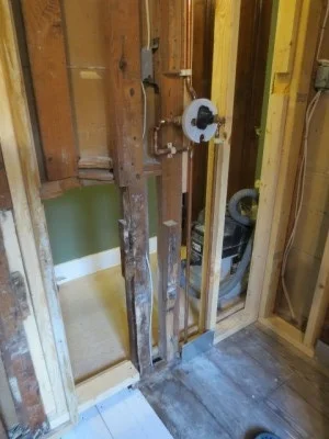 The ‘Hall Bath’ is gutted back to the subfloor.