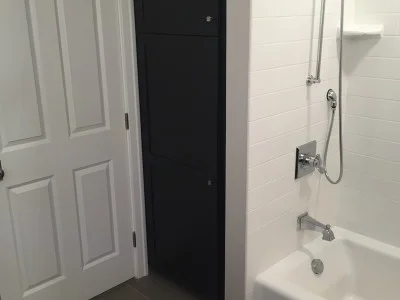 Space is borrowed from an old built-in unit to enlarge the old bath area for a walk-in shower.