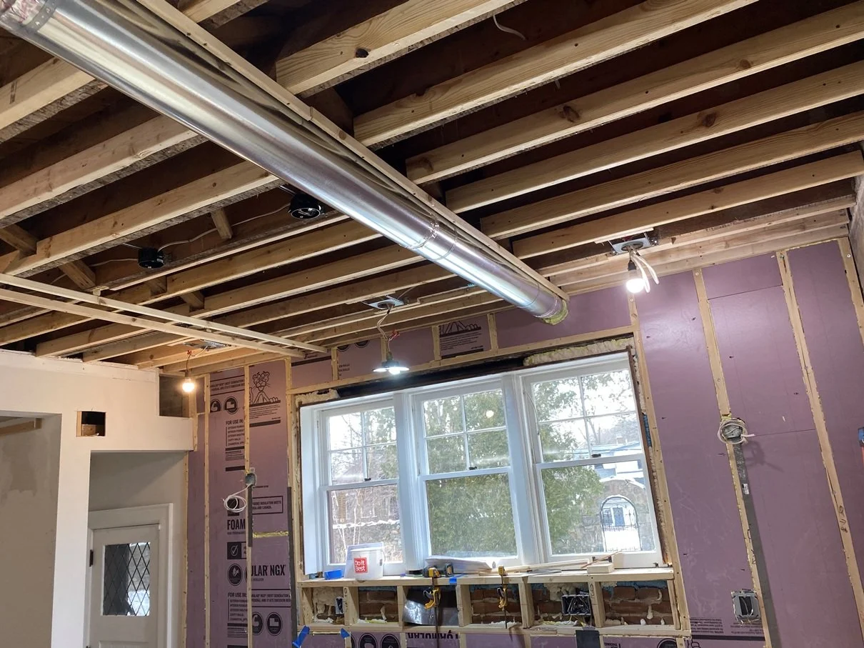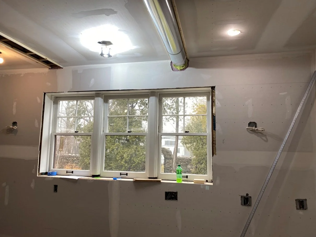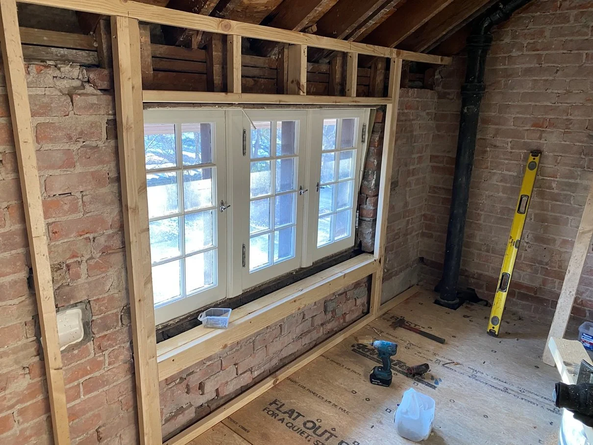 Working with three-course brick always requires extra attention to the hidden infrastructure. Our team repaired the original masonry where the old range exhaust exited the house, and we are currently furring out the brick walls to create space for modern electrical and proper insulation. We’ve also reinforced and framed the area under the windows to allow for new electrical placement, ensuring everything is perfectly prepped for the upcoming precision of the custom cabinetry.