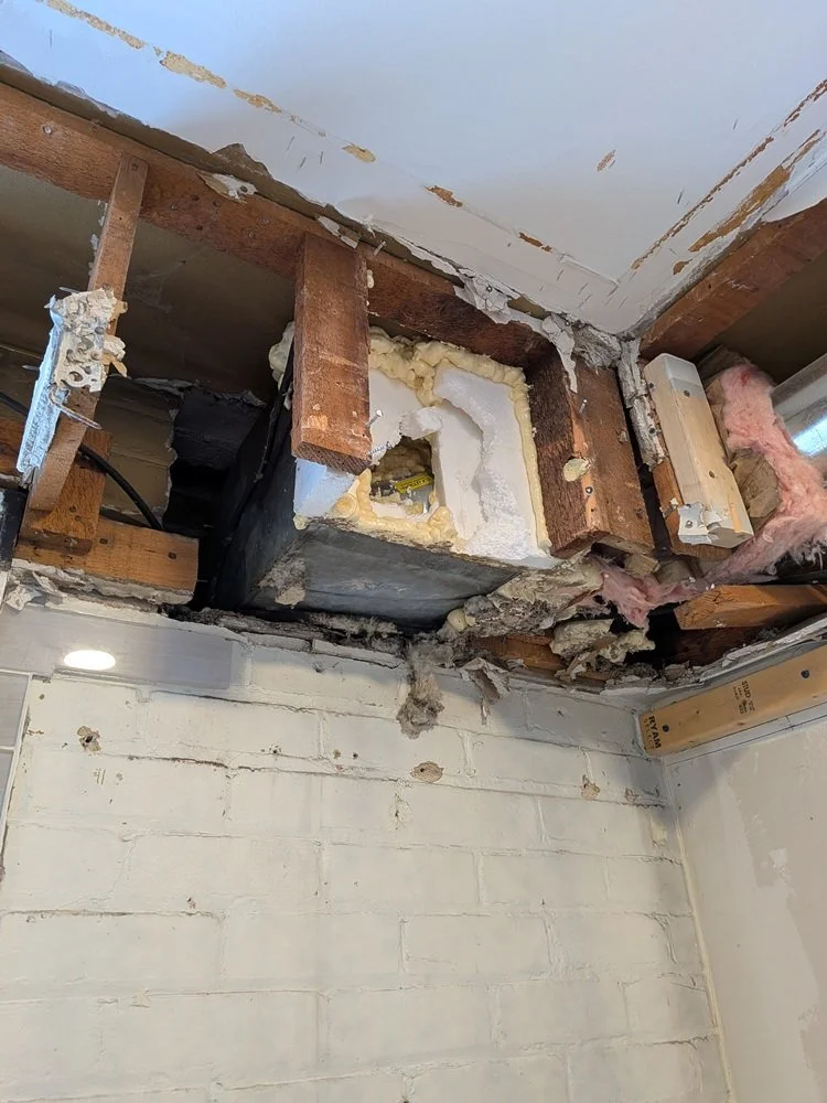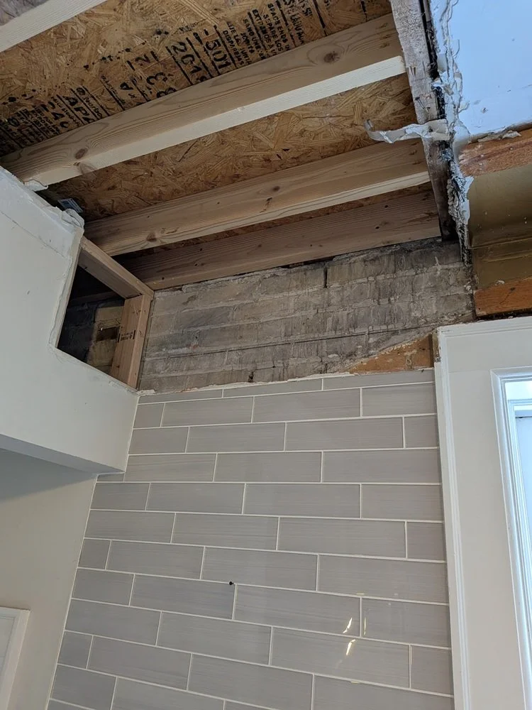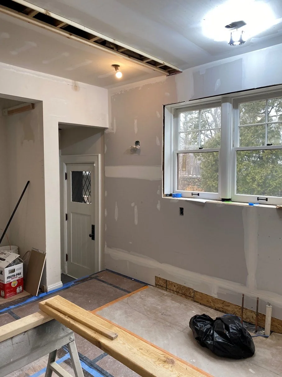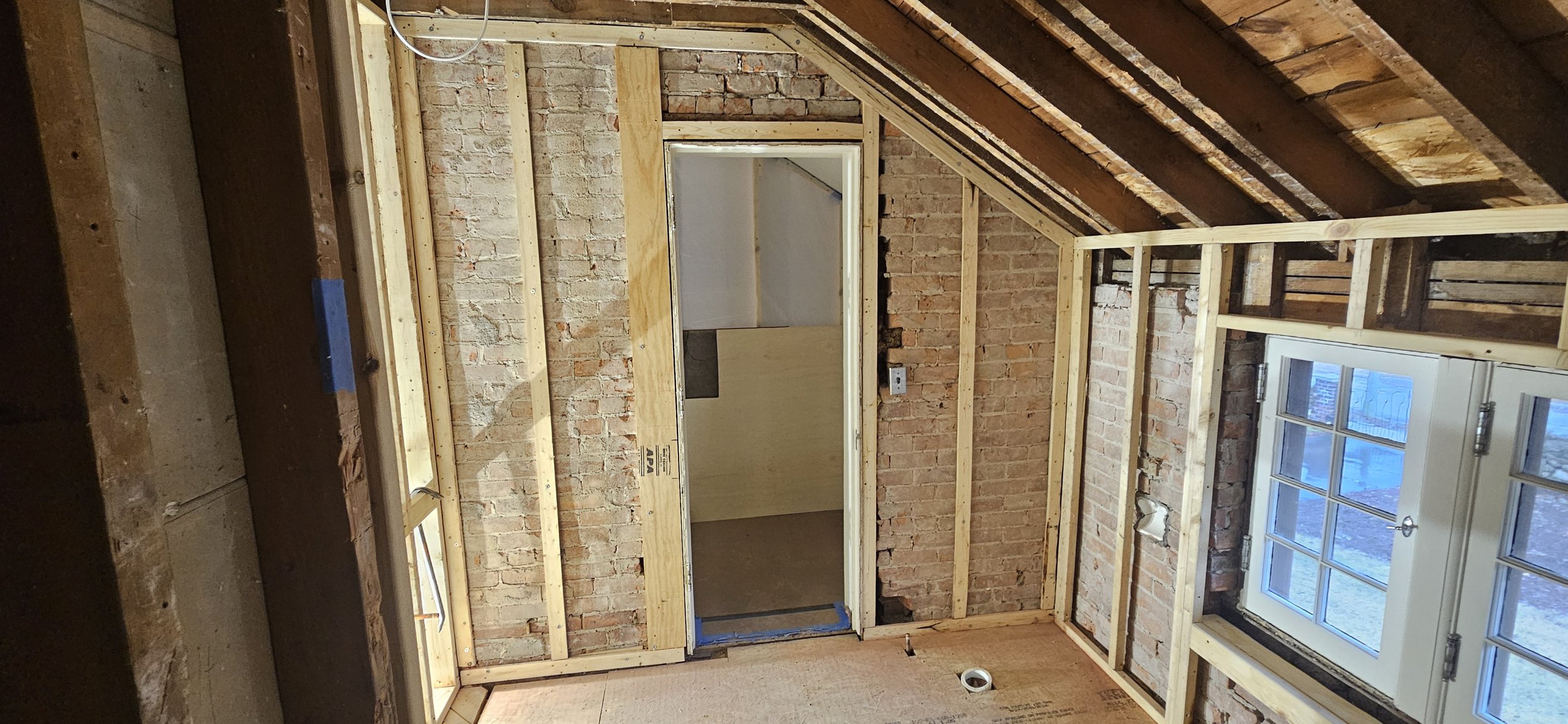 Working with three-course brick always requires extra attention to the hidden infrastructure. Our team repaired the original masonry where the old range exhaust exited the house, and we are currently furring out the brick walls to create space for modern electrical and proper insulation. We’ve also reinforced and framed the area under the windows to allow for new electrical placement, ensuring everything is perfectly prepped for the upcoming precision of the custom cabinetry.