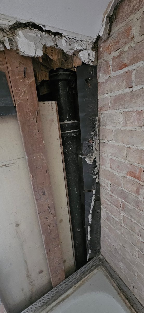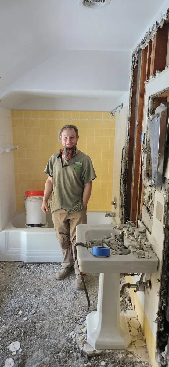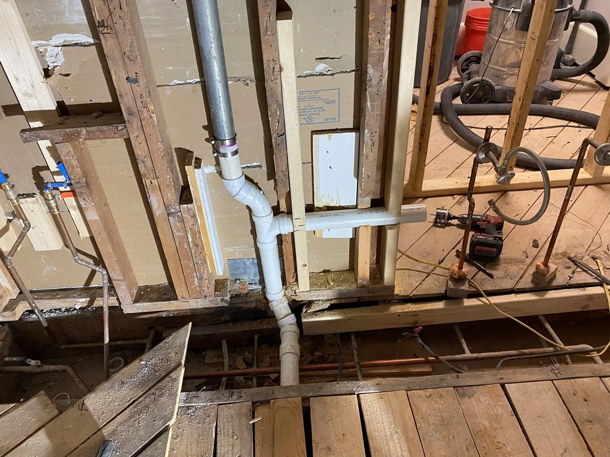 Sam has started demolition in the 2nd floor bathroom. With old houses, there are often surprises that need to be worked out. For example, when an old cast iron drain stack was discovered and will have to worked around or moved.