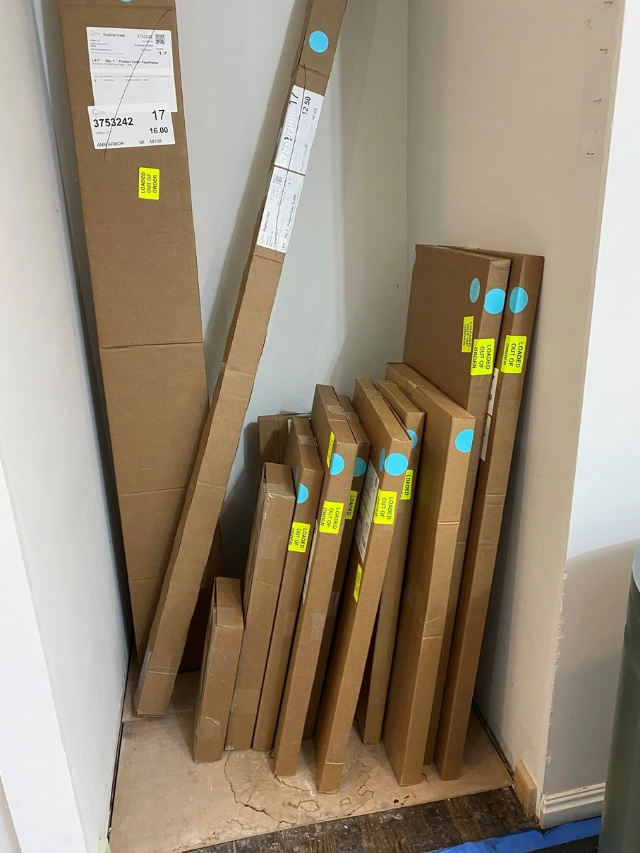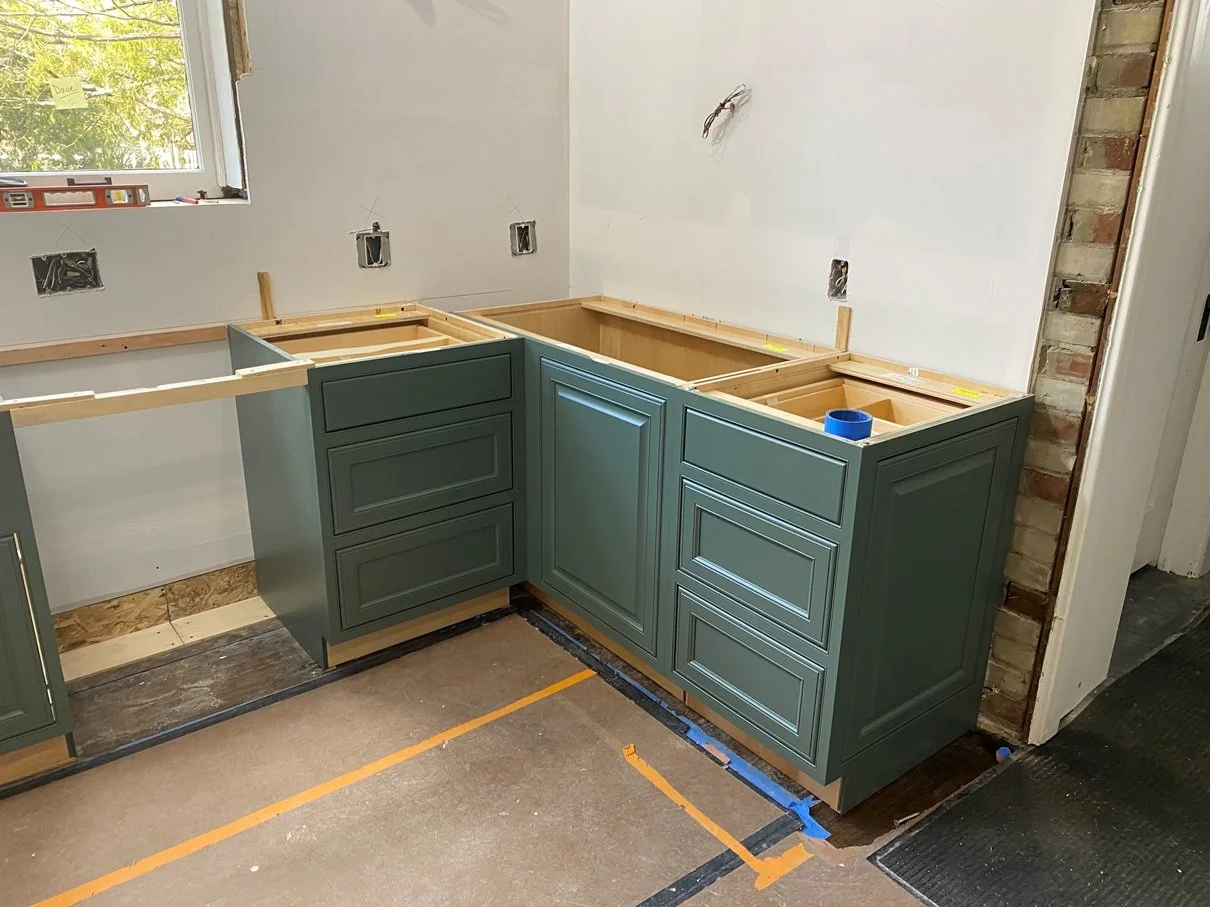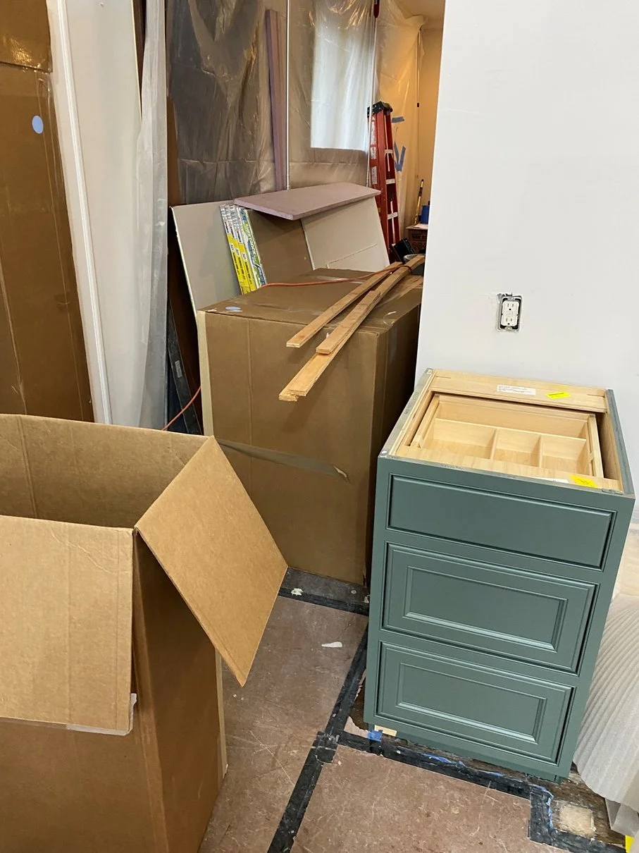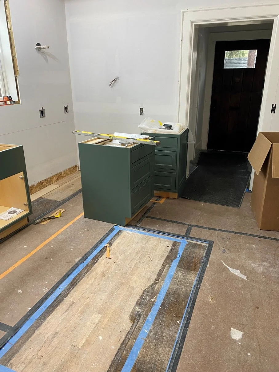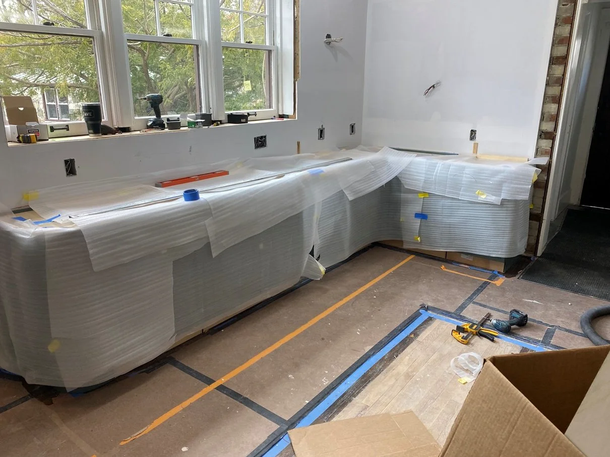 Once the lower cabinets are installed, they are wrapped and protected as the rest of the cabinetry and tile work continues.