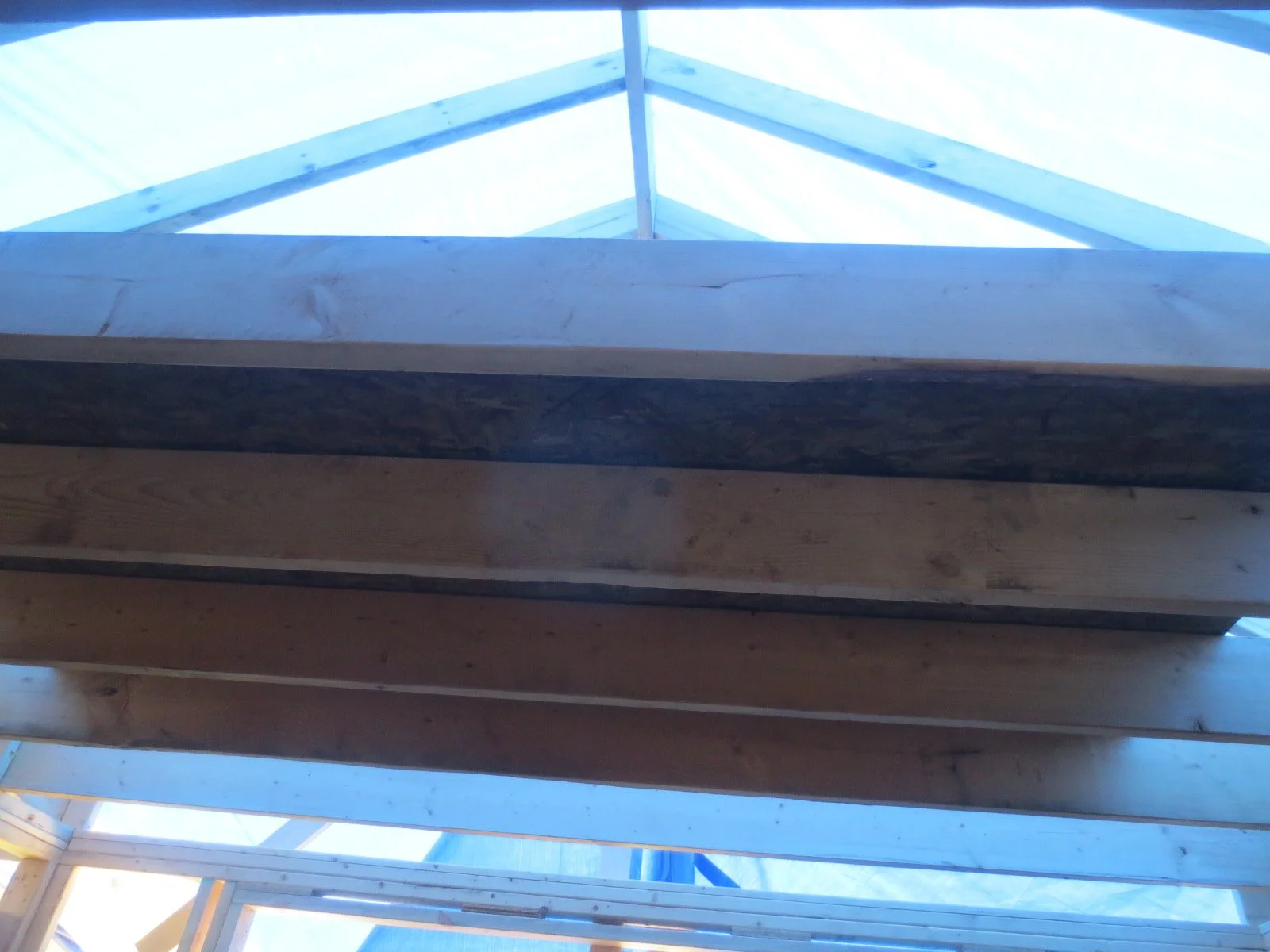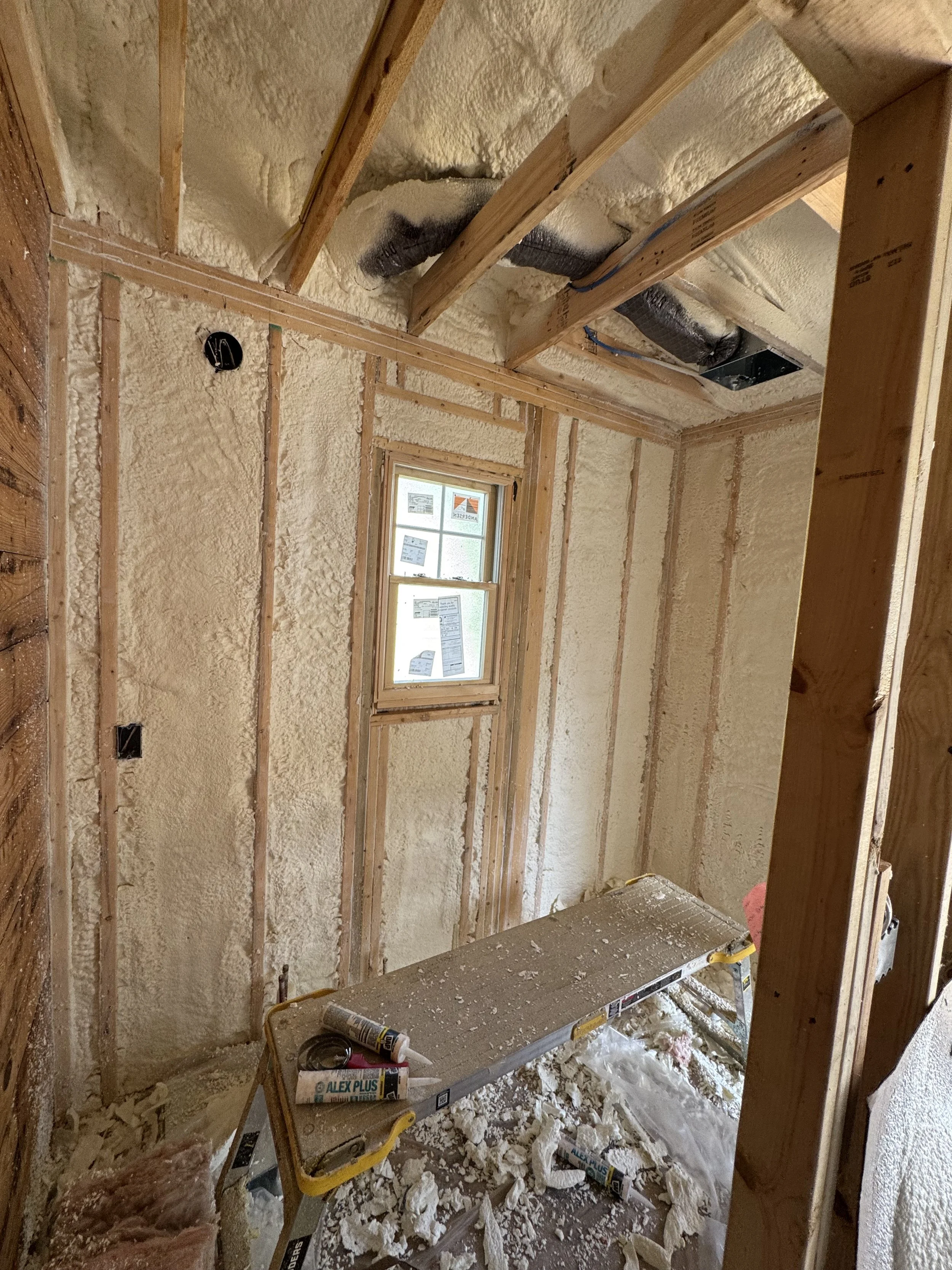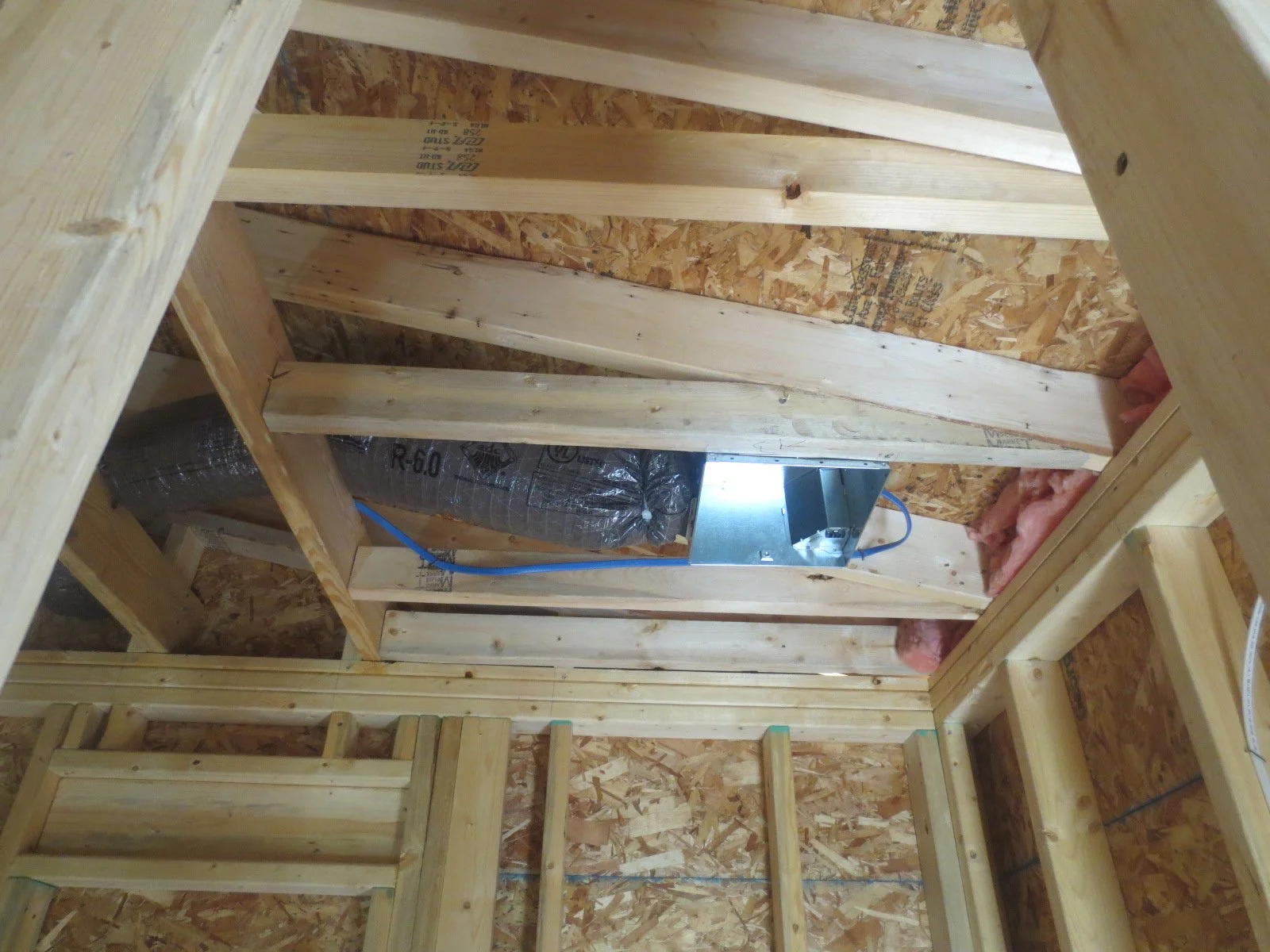 Diagonal rafters and ceiling joists with the new fan above the future shower.