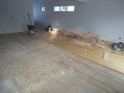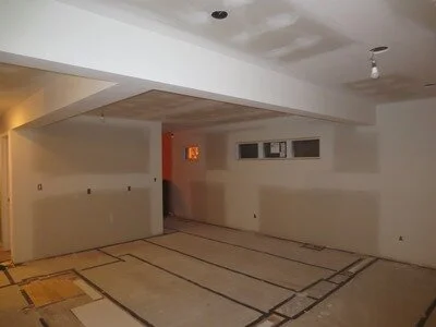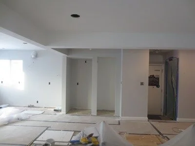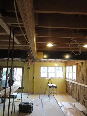 The drywall crew arrives. The new beams will be wrapped with drywall and painted. Plumbing and electrical are tucked in next to the beam.