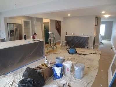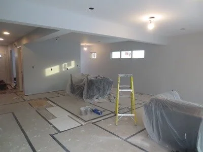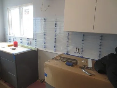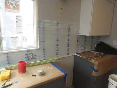 Protecting the newly installed cabinets / countertops as back-splash is going in.