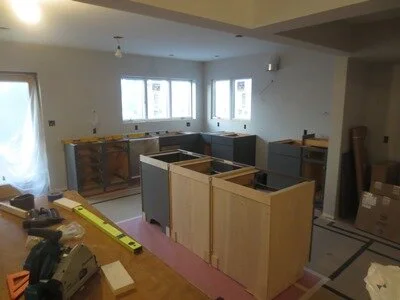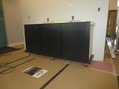 This little nook will contain a beverage refrigerator. With all the base cabinets installed, we have the countertops measured and fabricated.