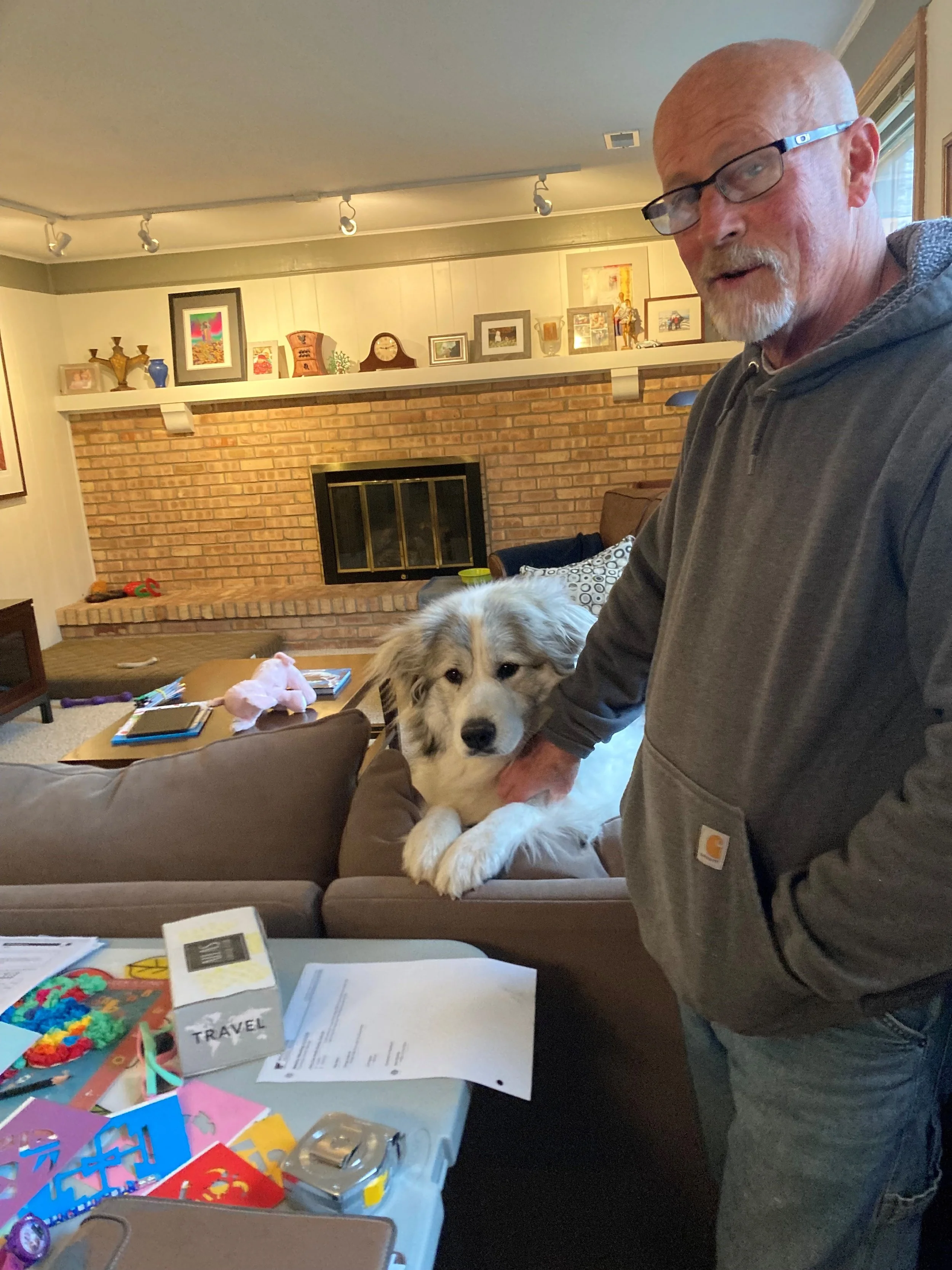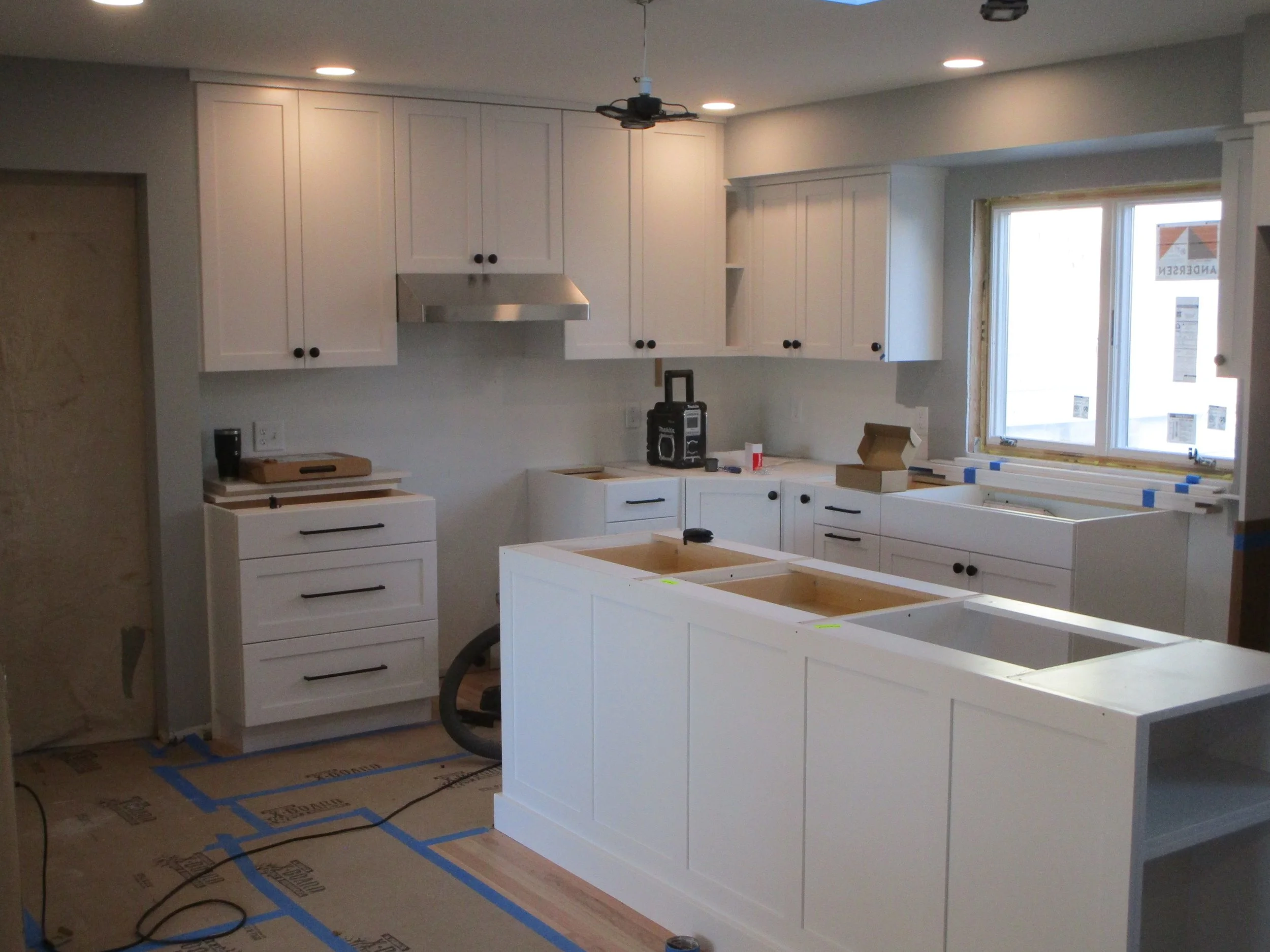 Dave (Lead Carpenter) and Amy (Project Developer) at our regular weekly meeting with our great clients. Yellow painted cardboard helps everyone visualize the location of the pendant lights over the island.