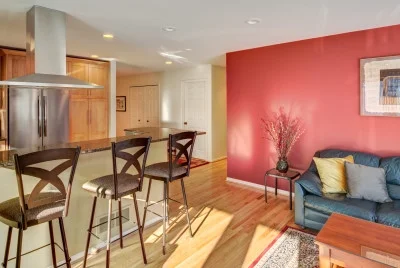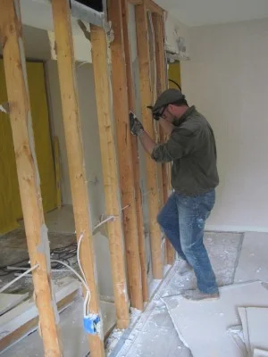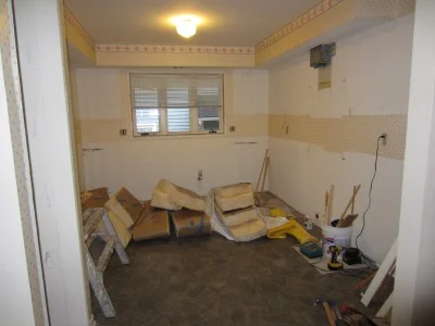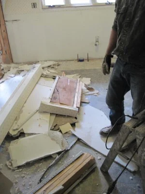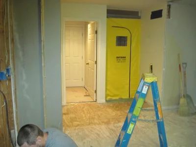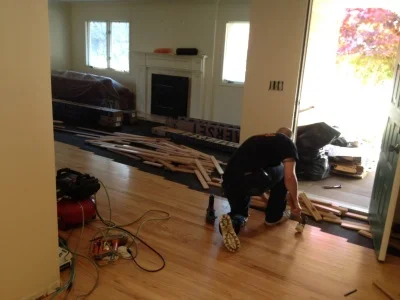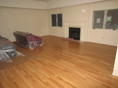 Here, the hardwood floors are going down. Furniture has been dust protected and shifted around the room to allow the work to be completed.