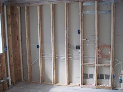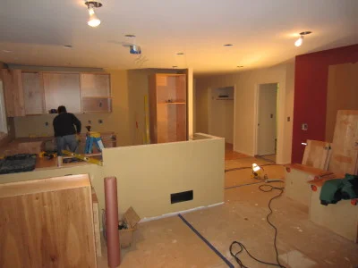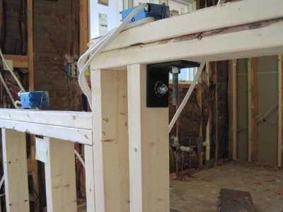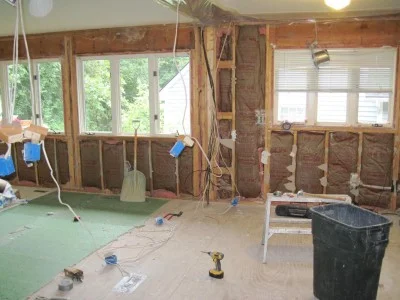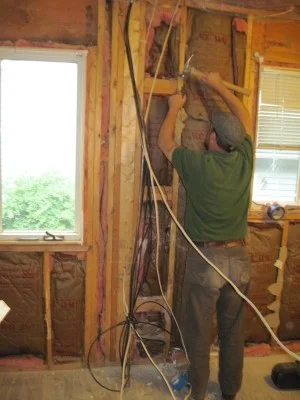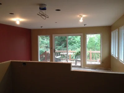 Rough electrical is complete. The drywall has been primed and the first coat of color has gone on the walls. Bold colors will contrast well with the light colored trim (still to come) around windows and doors.