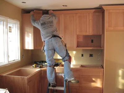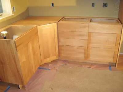 Custom kitchen cabinets have been installed, and the crown mouldings are going up.
