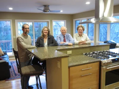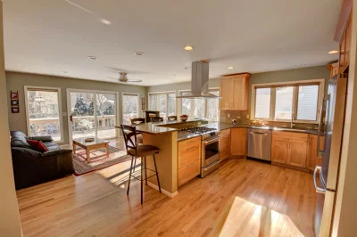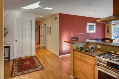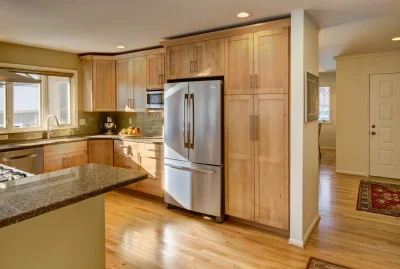 Maple cabinetry, custom made in Ann Arbor, prefinished Red Oak flooring.