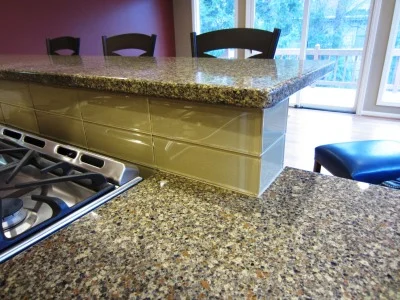 Glass backsplash tiles by Lunada Bay, quartz countertops by Vicostone.