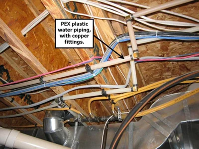 The existing house was built with PEX plastic piping for all hot and cold water. Though this saved money initially, it is susceptible to pitting at the copper fittings, and several leaks developed in this home.