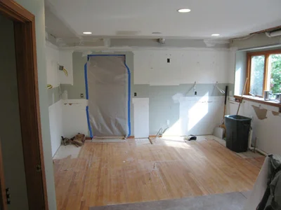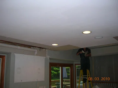 New drywall is being installed where needed, while the existing is inspected and repaired as necessary. The goal is to have a uniform finish throughout the new kitchen.