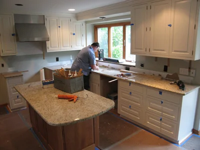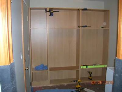 The first run of cabinets are in place and being leveled, adjusted and installed.