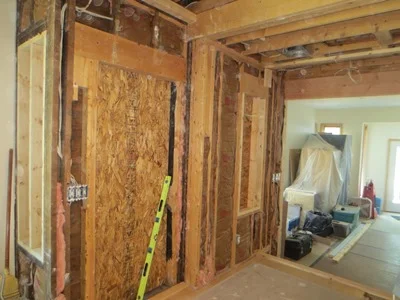 All of the drywall within the work area is removed in order to expose the homes existing structure.