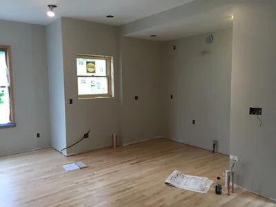 The newly refinished maple floors have been thoroughly protected and cabinets have arrived!