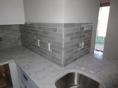 The countertops and wall tile have been installed.