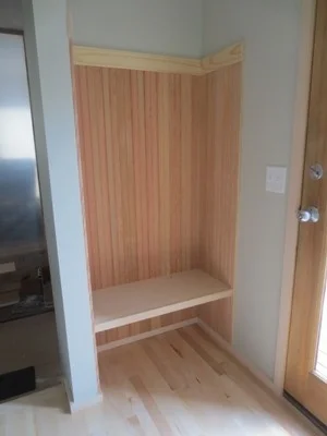 A built-in bench and coat hooks will be installed in this space.