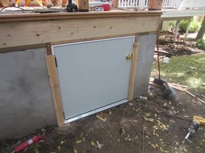 The deck gets a new set of stairs to grade level and porcelain tile floor is laid inside the porch.