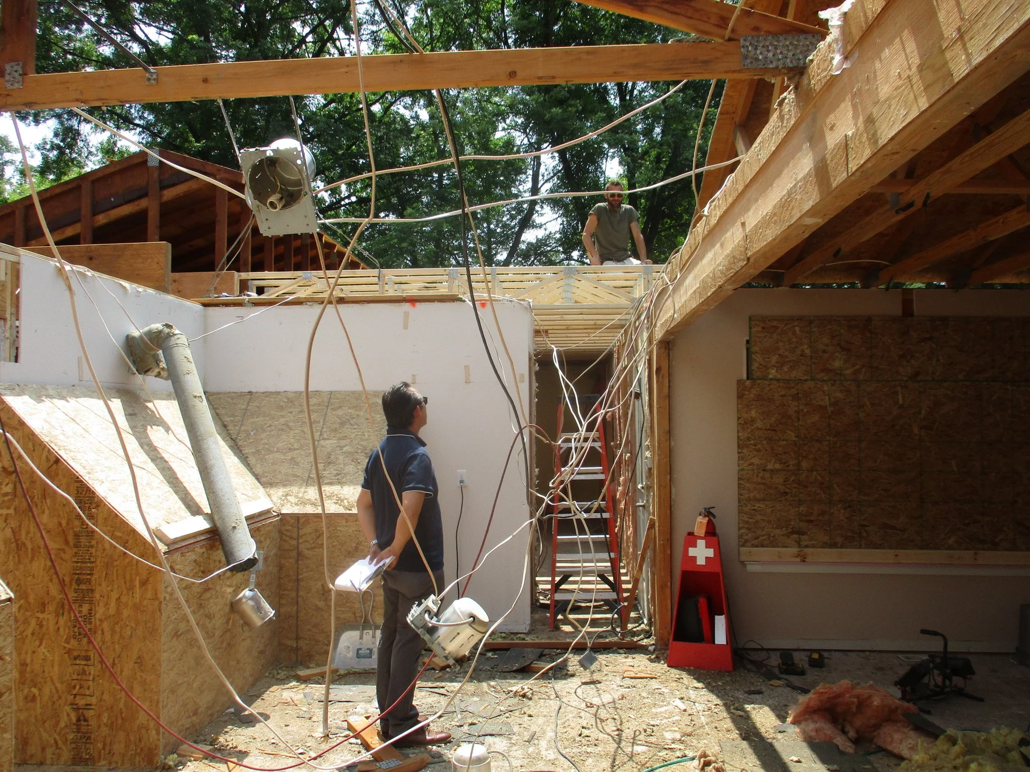 Lead designer Neo is on site chatting with the framing crew chief.