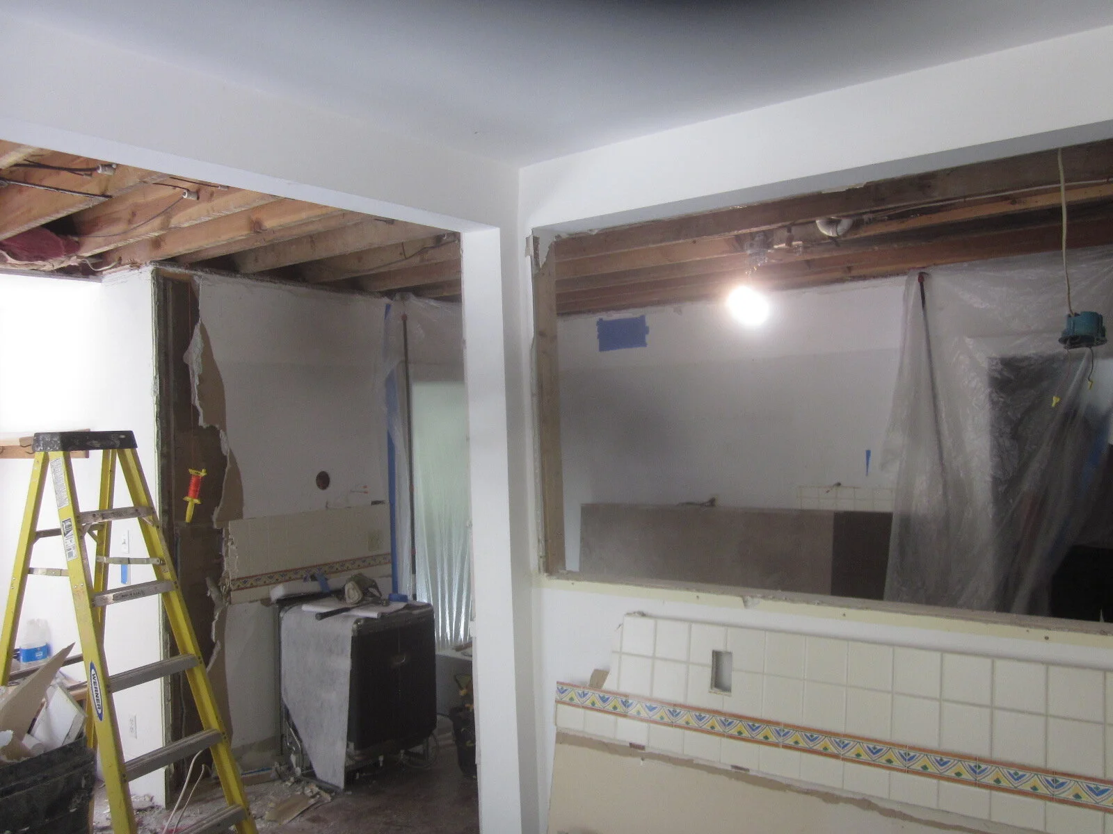 The demolished kitchen, and a view of exercise area room from the kitchen.