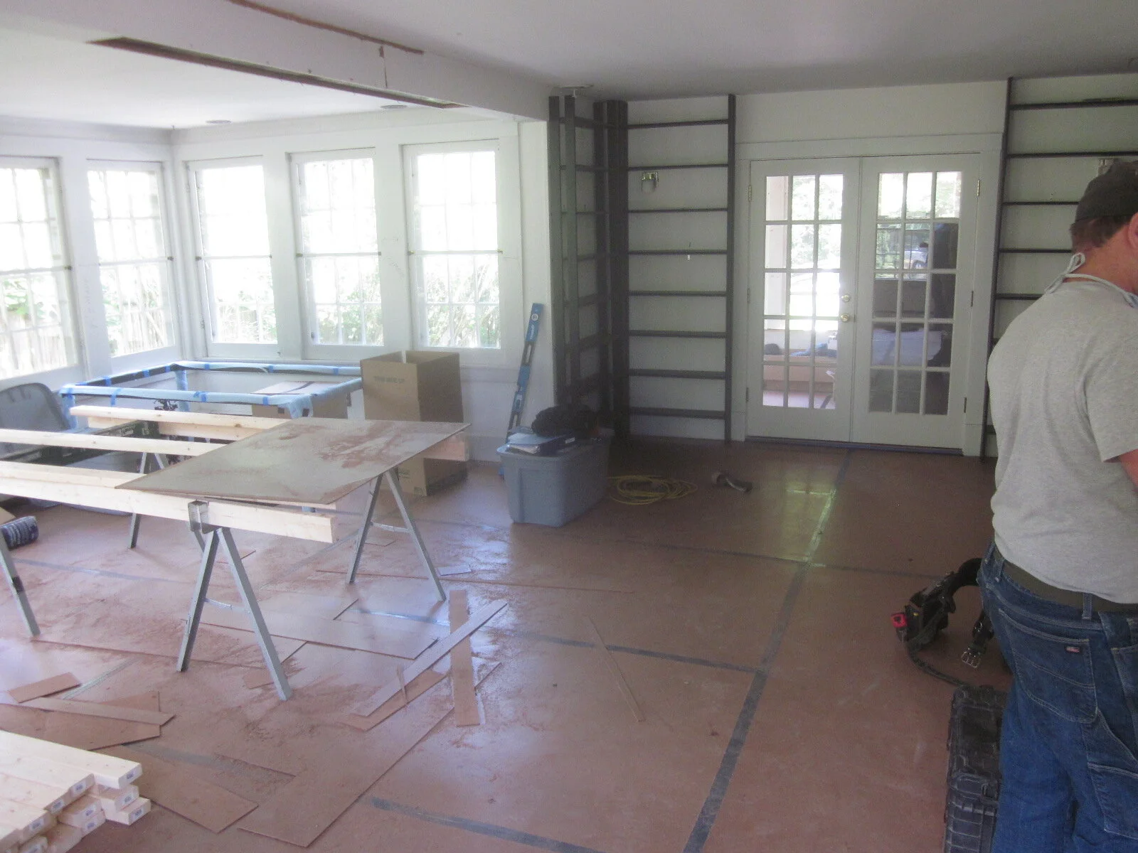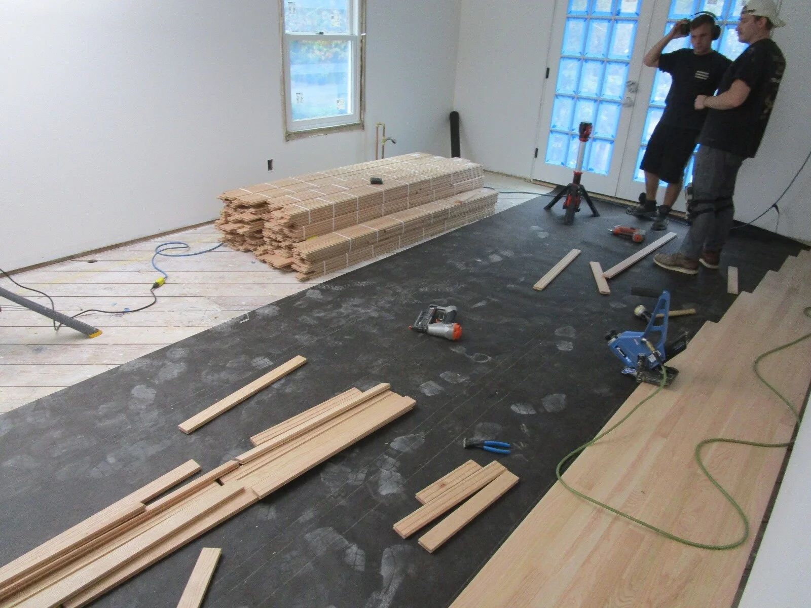 Now that the wood floorboards acclimated to the home’s temperature, they’re being installed.