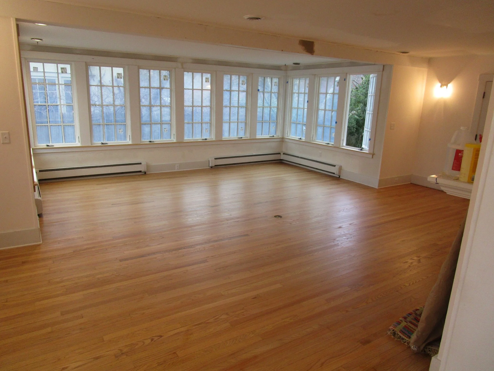 The floors are uncovered, cleaned, and readied for the final sanding and coating.